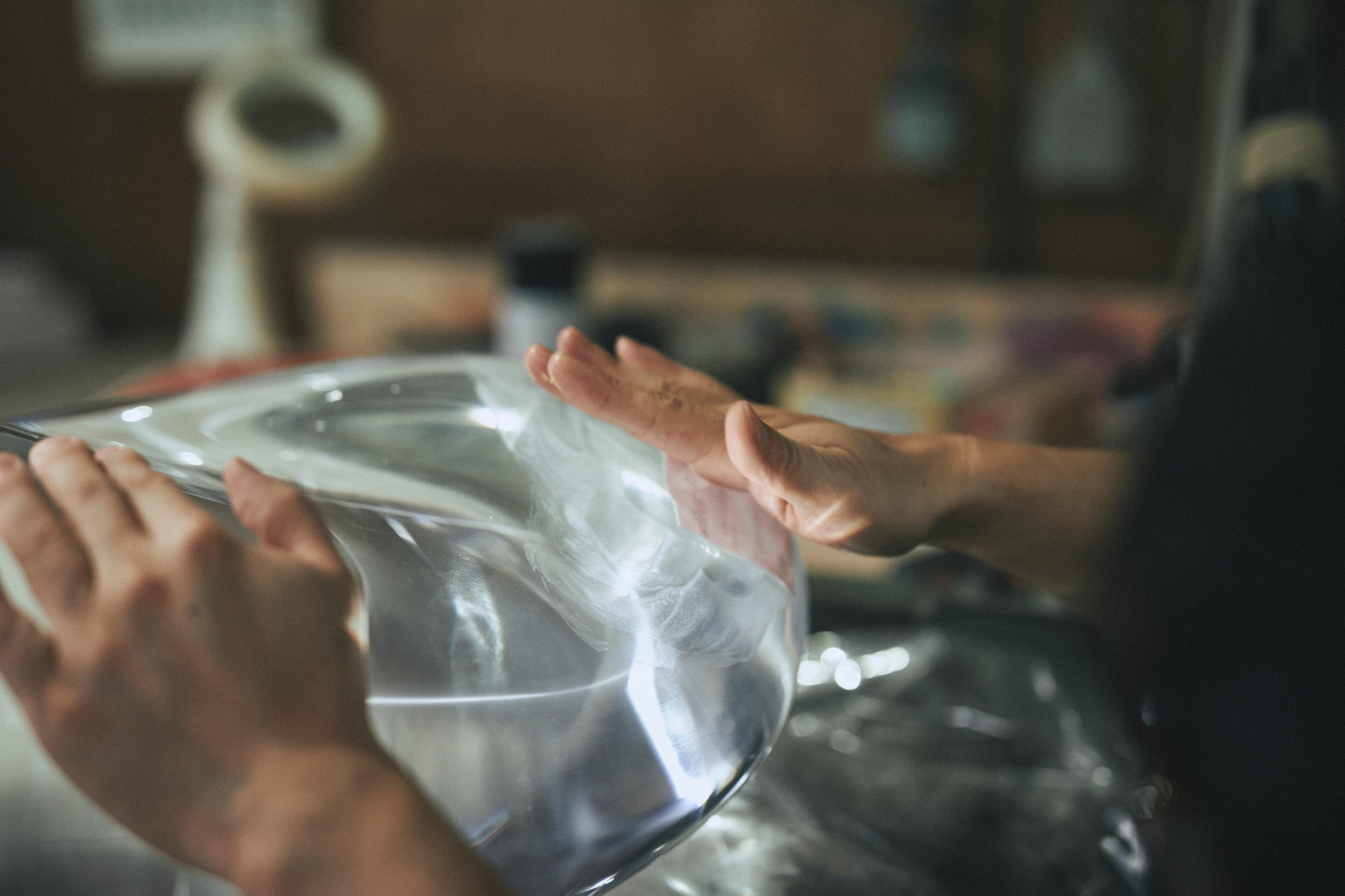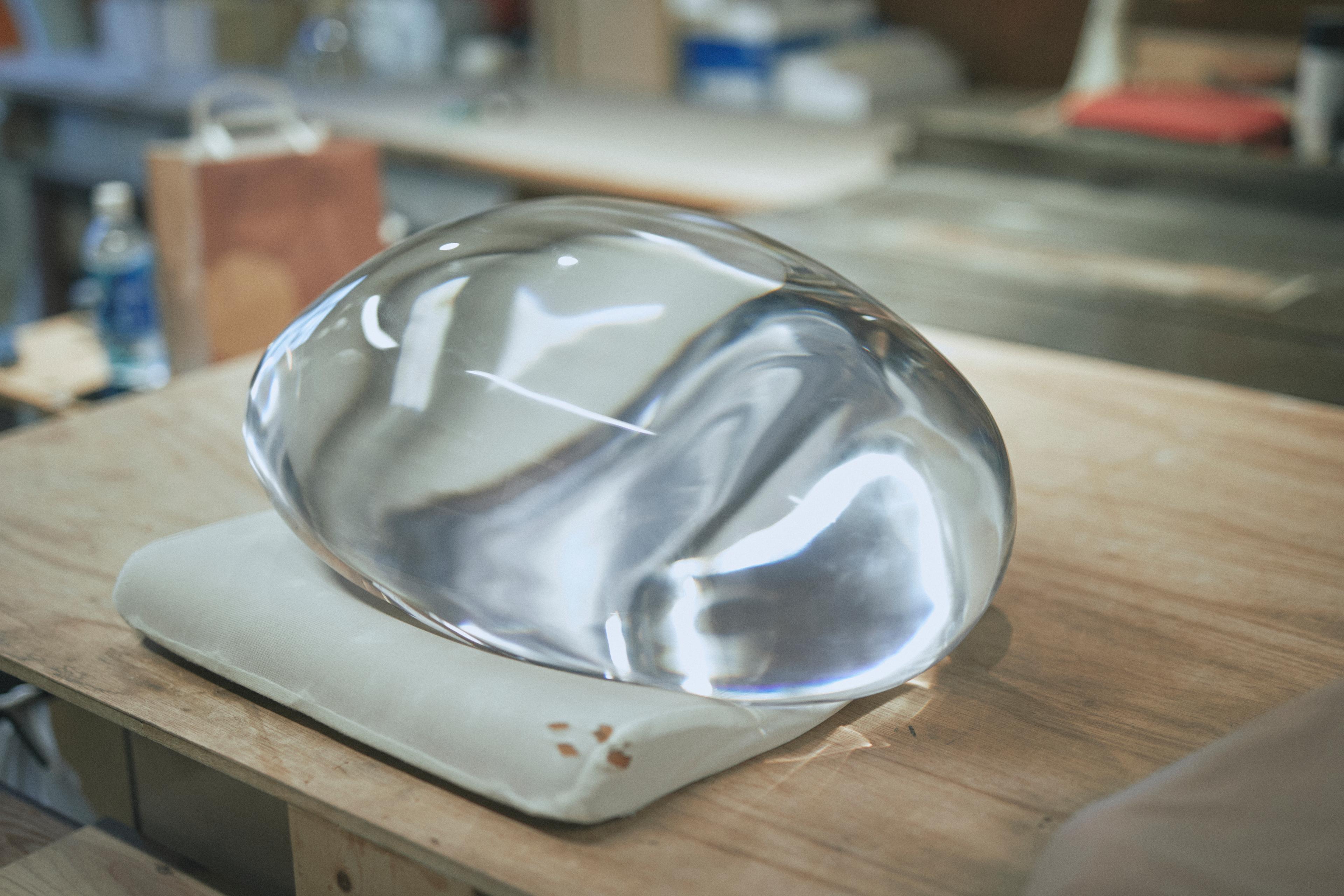 「透明であることってすごく難しいんです。不透明なものは収まりが悪いところは目隠しができるけれど、アクリルは透明なのでごまかしが効きません。削っている時は全体がマット(不透明)で、傷がどこについているか判別できないので1回磨いて確認する必要があります。今回は球体なので、反対側に細かい傷があると屈折率の関係で拡大されて、わずかな傷が大きく見えてしまうので特にシビアに。あらゆる角度から傷の有無をチェックして、傷があれば削って磨いてをひたすら繰り返す。3歩進んで2歩下がるような作業の繰り返しでした。でも、それだけきれいに磨かないと液体のような水の質感は表現できないだろうと」