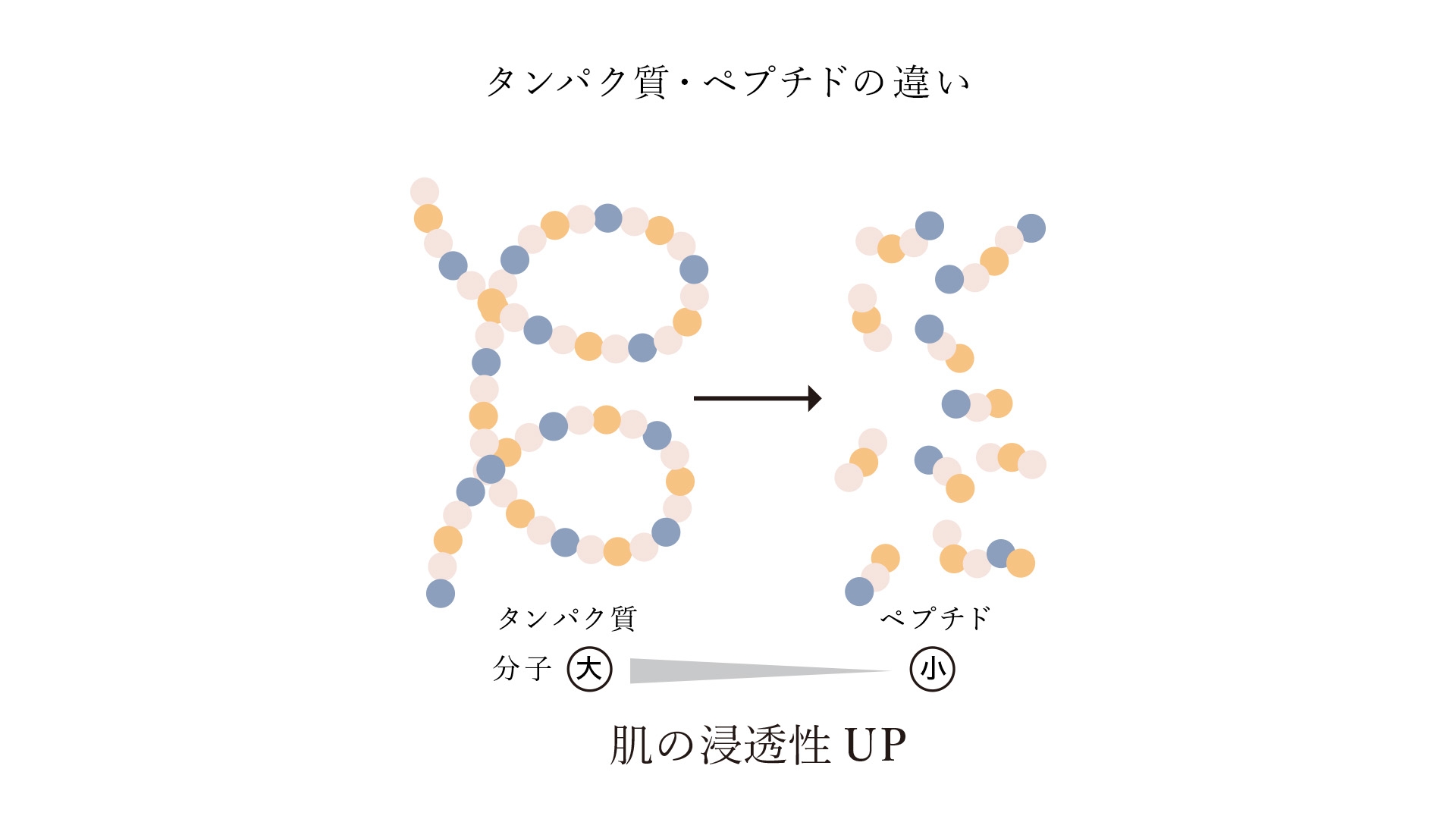 たんぱく質からペプチドへ加水分解をすることで、肌への浸透をよくするための低分子化を実現しました。